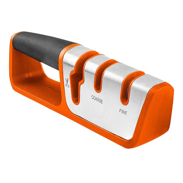 Brousek na nože a nůžky 56-053 od společnosti NEO je nástroj s pouzdrem z nárazuvzdorného plastu ABC, částečně pokrytým nerezovou ocelí a pryží TPR.